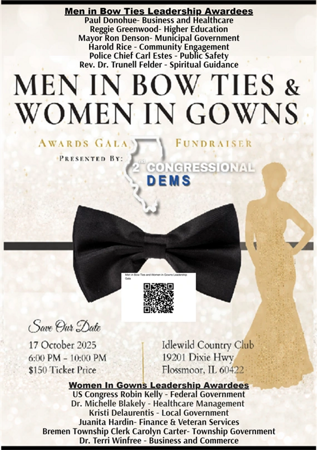 Join Second Dems for our Men in Bow Ties & Women in Gowns Gala Fundraiser on Friday, October 17, from 6:00 PM to 10:00 PM at Idlewild Country Club in Flossmoor.